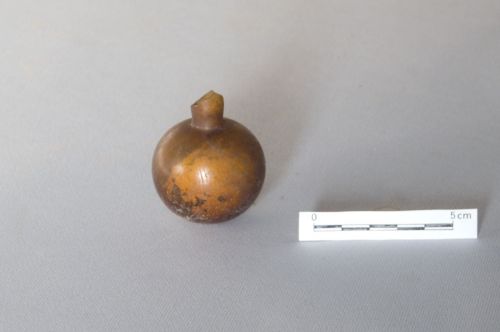 collo cilindrico sottolineato da una leggera strozzatura sotto l'orlo e alla base, ventre sferico, base piana; vetro giallo