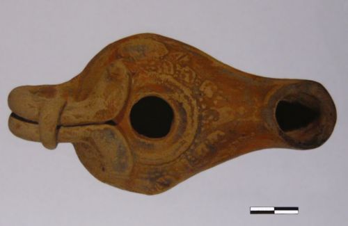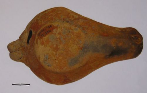 serbatoio romboidale sottolineato da alette cuoriformi; ansa a doppio bastoncello, verticale, sormontante, impostata sul disco; decorazione fitomorfa; fondo piano; rivestimento di colore rosso