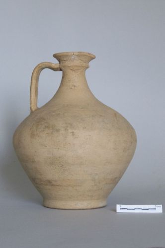 orlo svasato con versatoio, collo troncoconico senato da un collarino triangolare su cui è impostata l'ansa a sezione ellittica, corpo biconico, bassissimo piede ad anello; sulla parete esterna, ricoperta da un ingobbio chiaro, fasce dipinte in colore rosso bruno