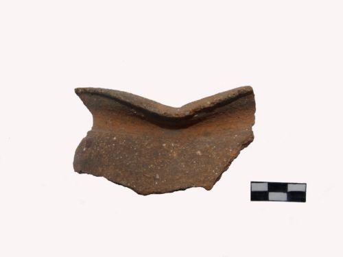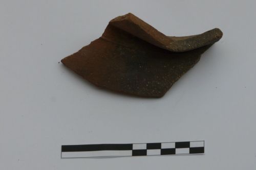 tipo Gazzo 2b: orlo a fascia superiormente appiattito, con incavo interno per il coperchio e leggera scanalatura esterna subito sotto il labbro, breve collo concavo sottolineato da sottilissimo listello in rilievo. Corpo ceramico molto ricco di inclusi quarziferi che, affiorando, rendono la superficie scabra al tatto. Esemplare con orlo deformato