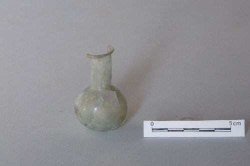 orlo inclinato verso l'esterno, estremità tagliata, collo cilindrico sottolineato da leggera strozzatura alla base, ventre sferico, base piana; vetro incolore