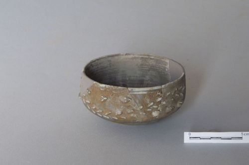 orlo ingrossato sottolineato da una solcatura, parete emisferica, bassissimo piede a disco; decorazione a tralci d'edera e punte di diamante applicate alla barbotine