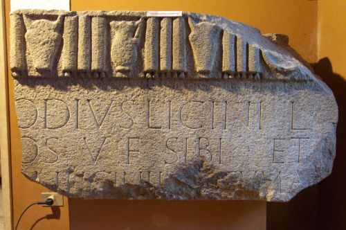 monumento funerario a dado di C. Clodius e Clodia Maxuma, decorato da fregio dorico a metope con, alternati, bucrani, patere e rosette girate