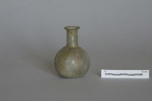 orlo inclinato verso l'esterno, estremità tagliata, collo cilindrico sottolineato da leggera strozzatura alla base, ventre sferico, base piana; vetro incolore