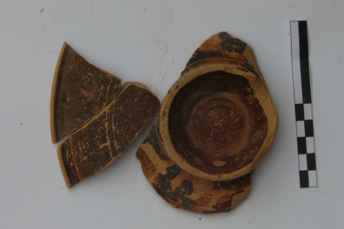 orlo indistinto leggermente estroflesso, vasca profonda, ipede ad anello molto alto (insolito per una esemplare di questa forma); impasto depurato, farinoso al tatto, caratterizzato dalal rpesenza di vacuoli e di molti inclusi micacei; vernice sottile di pessima qualità, di colore nero opaco stesa irregolarmente con macchie di colore bruno; sul fondo esterno sono visibili zone a risparmio e segni di colatura