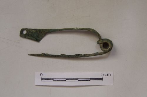 arco rettilineo sottolineato, in prossimità della molla, da un'espansione sagomata e decorata a lieve incisione; molla a quattro spire; piede forato