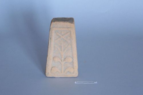 peso da telaio troncopiramidale, con base rettangolare e foro pervio sulla sommità, con faccia anteriore decorata da motivo vegetale stilizzato sormontato da una X, inquadrato in una cornice a rilievo