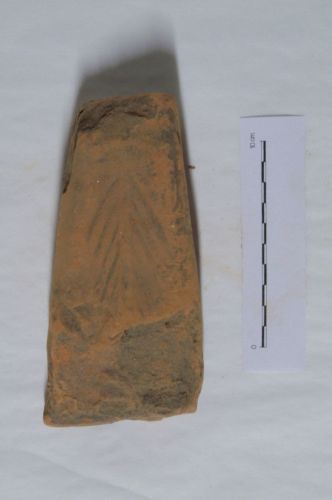 peso da telaio troncopiramidale, con base rettangolare e foro pervio sulla sommità, con faccia anteriore decorata da motivo a spina di pesce