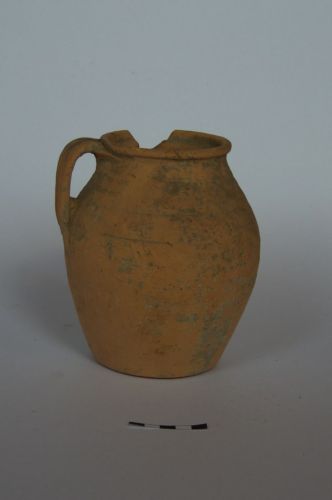 corpo globulare leggermente schiacciato e piccolo orlo espanso a margine indistinto; ansa a nastro poco rilevata e fondo piano