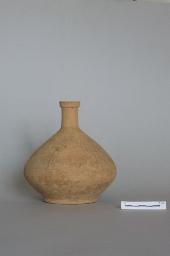 orlo a fascia. collo cilindrico, corpo biconico, bassissimo piede ad anello; la superficie presenta delle macchie brunastre che sono forse tracce di una verniciatura.