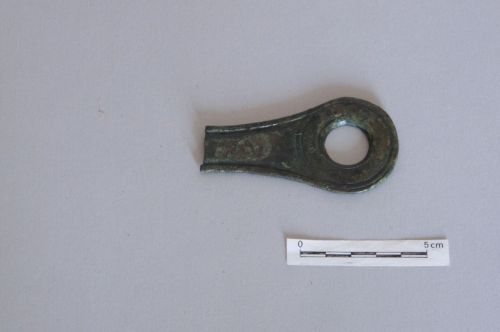 ansa a nastro rettilineo con terminazione arrotondata e foro centrale per la sospensione; margini ingrossati