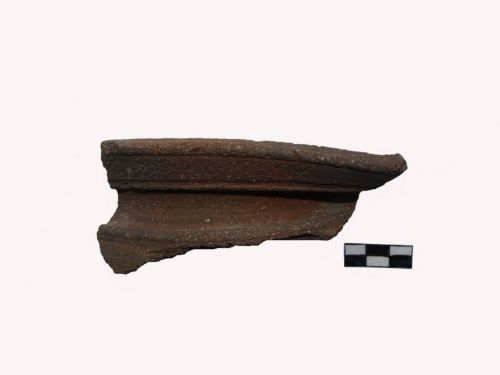 tipo Gazzo 2b: orlo a fascia superiormente appiattito, con incavo interno per il coperchio e due leggere scanalature parallele esterne subito sotto il labbro, breve collo concavo sottolineato da sottiilssimo listello in rilievo. Corpo ceramico molto ricco di inclusi quarziferi che, affiorando, rendono la superficie scabra al tatto. Esemplare con orlo deformato
