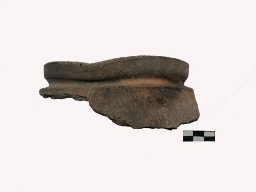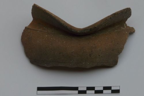 tipo Gazzo 2a: alto orlo a fascia superiormente appiattito e con incavo interno per il coperchio e legera scanalatura estrena subito sotto il labbro, breve collo concavo sottolineato da sottiilssimo listello in rilievo. Corpo ceramico molto ricco di inclusi quarziferi che, affiorando, rendono la superficie scabra al tatto. Esemplare con orlo deformato e ripiegato all'esterno