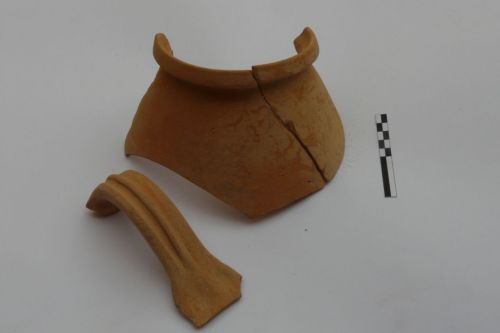 tipo Gazzo 6a: orlo a sezione triangolare con incavo per il coperchio, corpo ovoide; ansa tricostolata