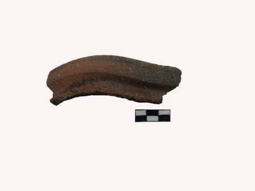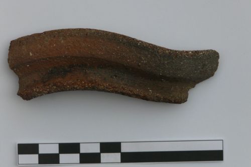 tipo Gazzo 2b: orlo a fascia superiormente appiattito, con incavo interno per il coperchio e leggera scanalatura esterna subito sotto il labbro, breve collo concavo sottolineato da sottiilssimo listello in rilievo. Corpo ceramico molto ricco di inclusi quarziferi che, affiorando, rendono la superficie scabra al tatto. Esemplare con orlo deformato e ripiegato all'esterno