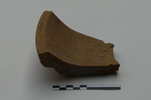 orlo indistinto, ingrossato e con sottie scanalatura sul bordo; accenno di listello subito sottostante; vasca poco profonda a profilo troncoconico e fondo piano. Sulla superficie interna del fondo sono stati inseriti grossi inclusi litici affioranti, atti a renderla ruvida e funzionale allo sminuzzamento di alimenti semisolidi da mescolare poi con liquidi