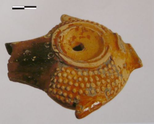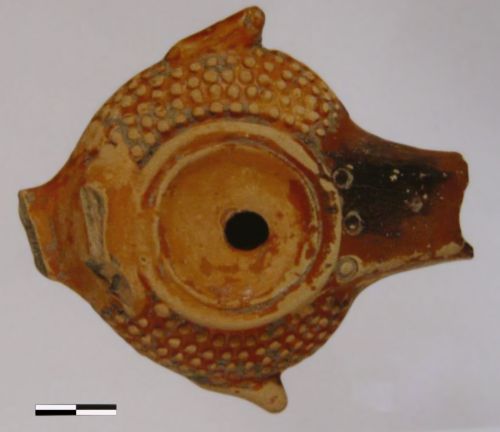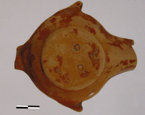 corpo biconico, spalla decorata da sei file di globetti; alete latrerali molto marcate, disco piano distinto da un cordone a rilievo tra due circonferenze incise; due cerchi impressi sul fondo; rivestimento rosso