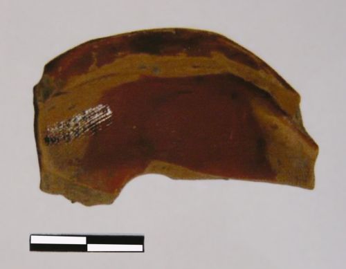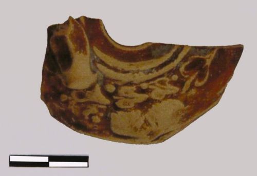 disco delimitato da doppio cordoncino a rilievo; spalla con decorazione fitomorfa; ansa probabilmente a doppio bastoncello. Rivestimento bruno rossastro