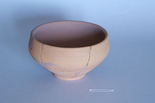 la coppa rientra in un gruppo ben definito di materiali, costituito per lo più da coppe decorate a rotella e rivestite da una vernice bruno arancio; la presenza di esemplari non rivestiti fa pensare alla produzione di piccole officine che avevano il compito di soddisfare l'intero fabbrisogno di una comunità (cfr. Bruno-Gabucci 2002