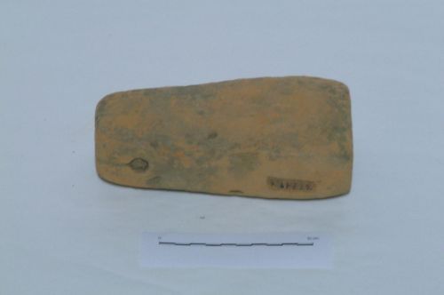 peso da telaio troncopiramidale, con base rettangolare e un foro pervio sulla sommità, dove è ben visibile il segno lasciato dal passaggio del filo nei fori