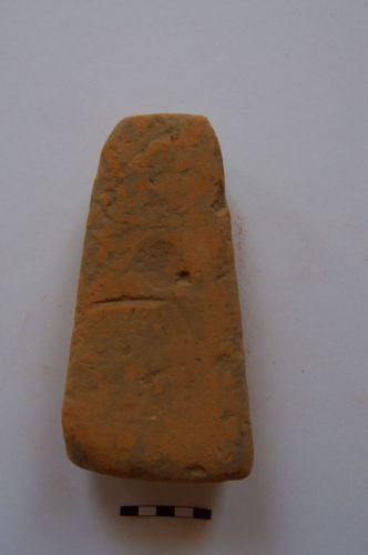 peso da telaio troncopiramidale, con foro pervio sulla sommità, con faccia anteriore decorata da motivo geometrico non ben leggibile, forse una spina di pesce