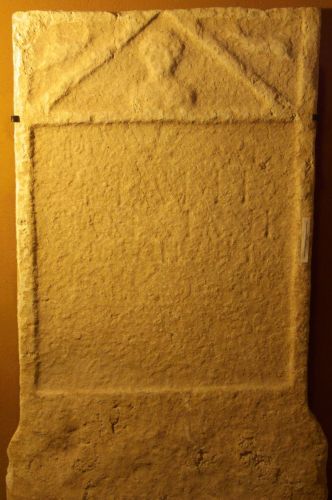 stele a pseudo timpano decorata da busto probabilmente femminile con capelli raccolti; ai lati del timpano due delfini volti verso il basso