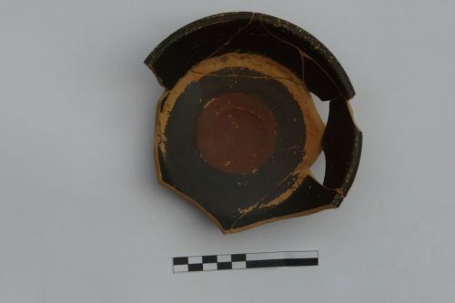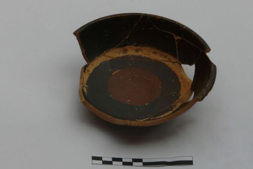 orlo instinto estroflesso, parete troncoconica, piede ad anello; impasto depurato, farinoso al tatto, caratterizzato dalla rpesenza di vacuoli e di piccolissimi inclusi biancastri; vernice spessa, di discreta qualità, di colore nero opaco, caratterizzata da una stesura irregolare sul fondo interno, dovuta forse a una rifinitura a pennello. Sia il fonod interno che quello esterno soo di colore rosso bruno