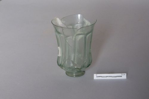 labbro sottolineato da una linea orizzontale incisa a freddo a mola, parete svasata, piede ripiegato ad anello; decorazione applicata a caldo dopo la soffiatura con filamenti dello stesso vetro: motivo ad anelli ovali allungati staccati fra loro (Biaggio Simona 1991, p. 104, motivo b)
