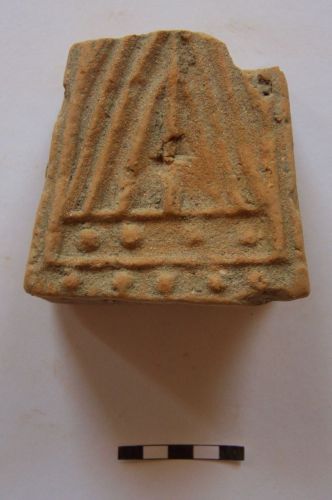 peso da telaio troncopiramidale, con base rettangolare e faccia anteriore decorata da motivo a spina di pesce e perline in cornice a rilievo