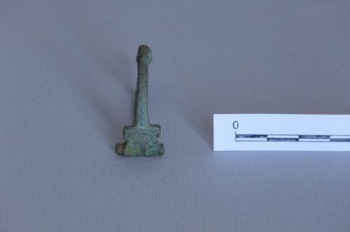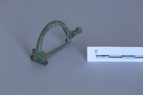 arco filiforme a sezione semicircolare decorato da costolature trasversali; cerniera ripiegata verso l'esterno; bollo sulla testa quadrata in cartiglio semicircolare