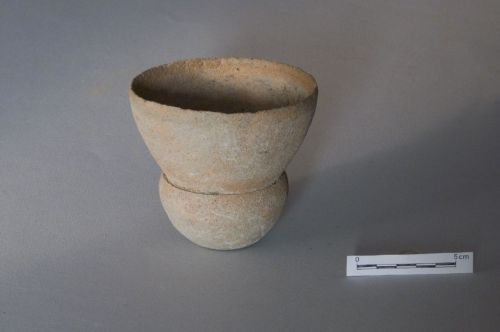 alto orlo inclinato all’esterno, corpo carenato, fondo piano; il punto di congiunzione fra orlo e corpo è sottolineato da una scanalatura