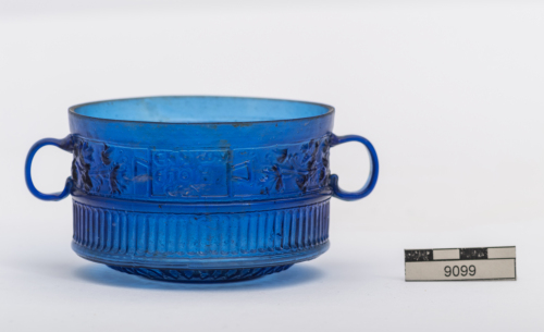 Coppa con orlo verticale e labbro tagliato, vasca cilindrica a pareti verticali, fondo convesso con basso piede ad anello, due anse verticali ad orecchia applicate nella metà superiore della parete. La superficie della vasca realizzata con una matrice a tre valve è suddivisa in due registri, di cui quello superiore presenta, su un lato, due tralci di vite che fiancheggiano una tabella ansata con iscrizione greca che ENNION/EPOIE/SEN; sull'altro lato si trova una seconda tabella ansata, sempre iscritta con caratteri greci riporta MNEZE/OAGORA/ZNO, tra due tralci d'edera. Una colonna ionica stilizzata separa alle estremità i due motivi decorativi; il registro inferiore è decorato da baccellature verticali. Il fondo, ornato da un motivo a reticolo e cerchi concentrici che costituiscono il piede, è realizzato con un ulteriore elemento di matrice.