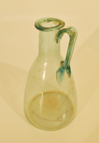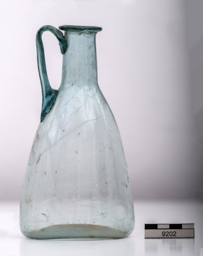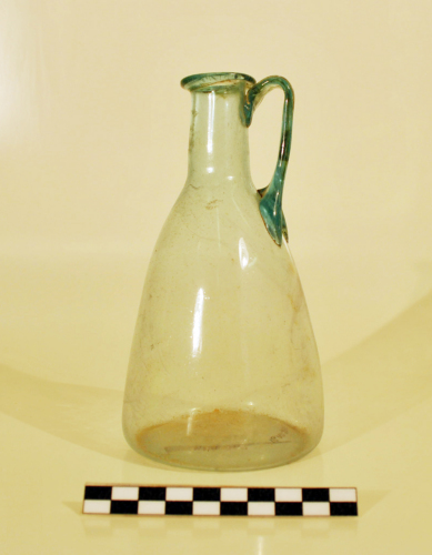 Bottiglia con orlo ribattuto orizzontale, breve collo cilindrico, sottolineato da una leggera strozzatura, ansa a due nervature, piegata a squadra, corpo conico, base concava.