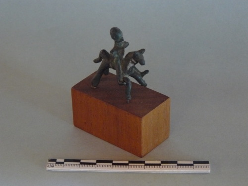 Bronzetto di cavaliere con testa subcircolare, su cui probabilmente si individua un elmo a calotta, il braccio destro risulta forato probabilmente serviva per l'inserimento della lancia; gambe lunghe e tese. Il cavallo è stato riprodotto durante la fase di corsa.