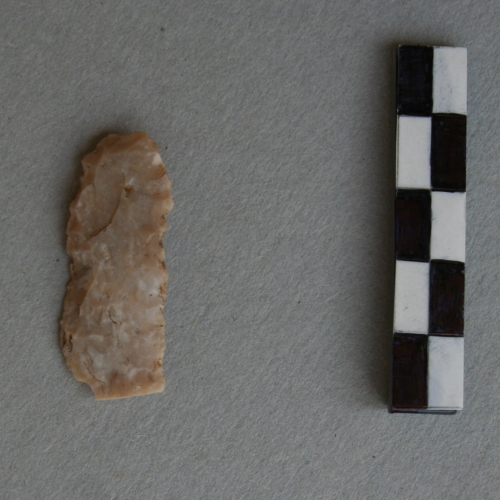 Raschiatoio foliato multiplo su lamella stretta, a ritocco piatto coprente bifacciale.