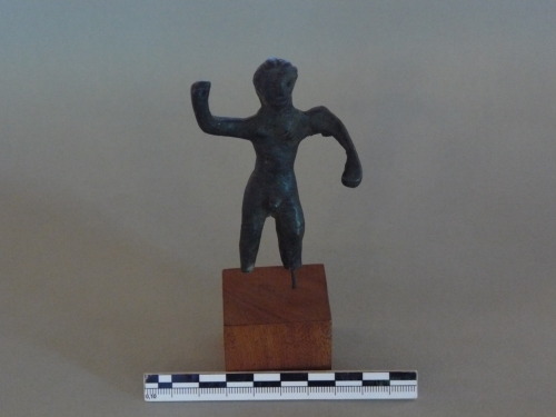 Bronzetto di eroe, la testa ha profilo subcircolare, i tratti del volto sono resi in modo sommario. Il corpo risulta schematico, braccio destro piegato e presenta foro passante su cui originariamente doveva essere fissata la lancia, sul braccio destro è avvolta dalla leontea; i genitali sono indicati da una leggera protuberanza e le gambe risultano leggermente divaricate.