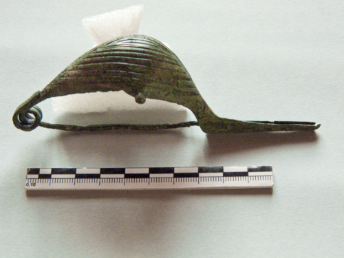 Fibula a navicella con bottoni laterali, arco decorato da solcature longitudinali, staffa lunga e molla a due avvolgimenti.