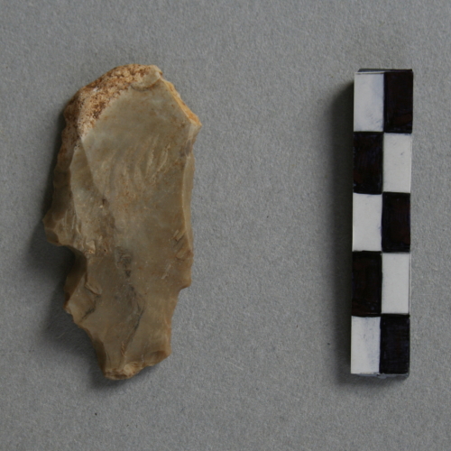 Raschiatoio denticolato su lama corticata, a ritocco semplice profondo, diretto parziale bilaterale.