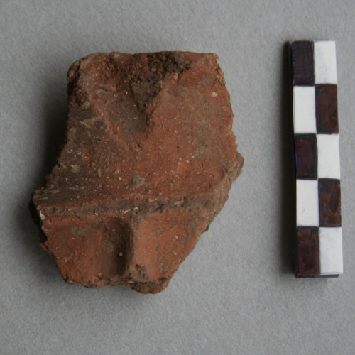 1 frammento di parete ed orlo di indeterminato, probabilmente un'olla, labbro ingrossato appena estroflesso, decorazione a cordonatura orizzontale e verticale con incrocio ortogonale a T, poco sotto l'orlo.