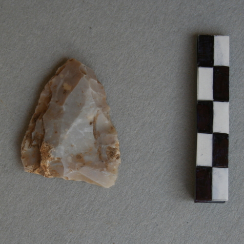 Punta foliata a base semplice subrettilinea, su spessa scheggia, a ritocco piatto invadente bifacciale.