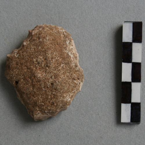 Grattatoio denticolato carenoide su scheggia di sbozzatura corticata, a ritocco denticolato profondo, continuo frontale e bilaterale.