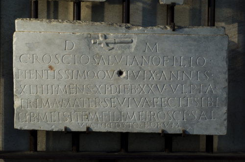 La superficie della fronte è stata lisciata, lavorata a gradina e poi levigata; la faccia superiore risulta rastremata, mentre i lati si presentano sbozzati grossolanamente. Asimmetria nella disposizione del testo e ductus irregolare ascendente: fino alla r. 6 tracce di linee guida, mentre a partire dalla r. 7 il corpo delle lettere diventa sempre più piccolo, con evidente errore di impaginazione nellultima r. Lettere apicate con ricerca dellombreggiatura: si nota esecuzione capovolta delle S. Segni di interpunzione a semplice solco.
