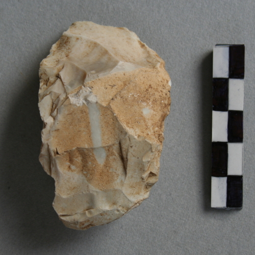 Ovaloide campignano a ritocco sommario, profilo ovale e sezione biconvessa. Corticato e con patina.