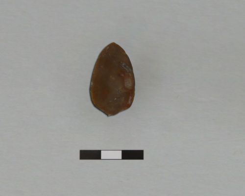 punta di freccia a ritocco piatto bifacciale, a base semplice arrotondata con ispessimento (accenno di peduncolo?)