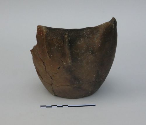 bicchiere trococonico con orlo liscio, parete a profilo convesso, fondo piatto leggermente concavo, decorato da segmenti plastici verticali impostati subito sotto l'orlo sulla parete