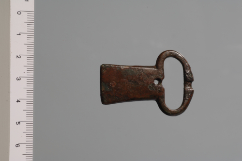 Fibbia a placca fissa trapezoidale con anello ovale espanso in corrispondenza della battuta dellardiglione, per la quale presenta un incavo; sul lato opposto dellanello una minuta traversa ricavata fra un foro interno e un incavo dellanello doveva permettere larticolazione dellardiglione. La superficie anteriore è liscia, i margini arrotondati; sul retro, piatto, si trovano due maglie forate per il fissaggio alla cintura.