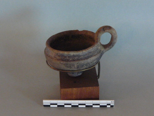 Piccola tazza a labbro svasato, orlo arrotondato, collo a fascia, spalla carenata, vasca a profilo troncoconico, fondo piano. Impasto semifine, colore marrone chiaro; superfici steccate.
