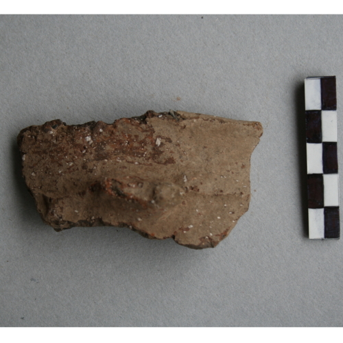 1 frammento di vaso a collo con presa a linguetta su decorazione a cordone a motivo a doppio arco.