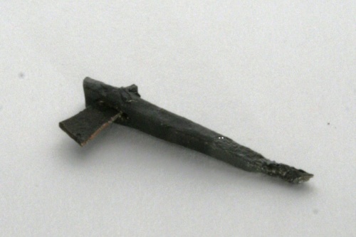 barretta a sezione quadrangolare, appuntita all'estremità inferiore; quella superiore, con bordo a taglio obliquo, presenta una fessura in cui è inserito un perno. Non è chiara la funzione dell'oggetto.