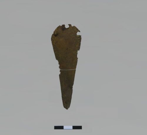 pugnale in bronzo, a base semplice a profilo arrotondato a tre fori, lama triangolare a lati leggermente concavi, a costolatura mediana poco accentuata e sezione romboidale